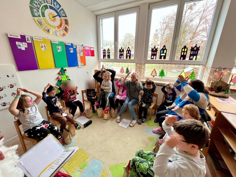 Zur Begrüßung sangen alle gemeinsam das bekannte Lied „Lasst uns froh und munter sein“ und sorgten so gleich für eine feierliche und fröhliche Stimmung. Anschließend sprach der Nikolaus mit den Kindern über die Geschichte des Heiligen Nikolaus und das Wunder von Myra, das die Gruppe bereits im Vorfeld durch Bilderbücher und ein Kamishibai kennengelernt hatte.