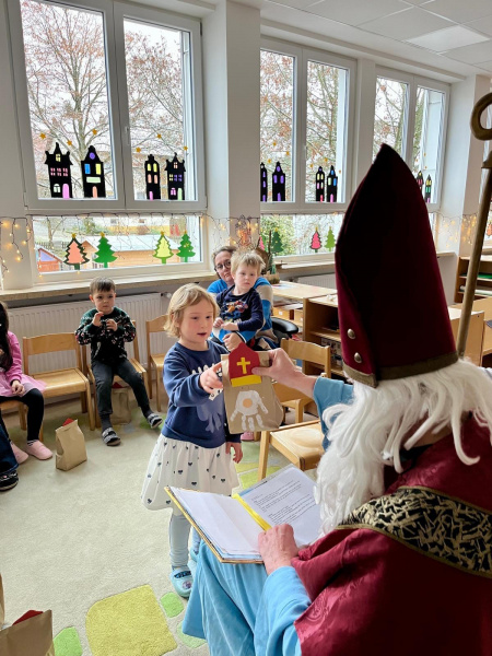 Der Nikolaus hatte für jedes Kind ein kleines Geschenk vorbereitet. Besonders stolz waren die Kinder darauf, dass sie ihre Säckchen zuvor selbst gebastelt hatten. Der Nikolaus füllte diese liebevoll mit Nüssen, Mandarinen, Äpfeln, Schokolade und einem Schokonikolaus. Weil der Nikolaus stets allen Kindern eine Freude macht, wollten die Kinder der SVE ihm in diesem Jahr auch etwas zurückgeben: Sie überraschten ihn mit zahlreichen gemalten Bildern und kreativ gestalteten Bastelarbeiten als Dankeschön. Zum Abschied führten die Kinder noch ein Fingerspiel auf und verabschiedeten den Nikolaus mit strahlenden Augen und viel Applaus.