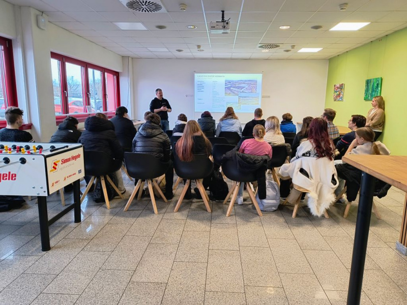 Nach der Ankunft wurden die Schülerinnen und Schüler vom Standortleiter Herrn Zitzmann begrüßt, der in einem Vortrag zunächst wichtige Eckdaten zum Unternehmen vorstellte und erklärte, in welchen Bereichen dort gearbeitet wird. Eine Vertreterin der Personalabteilung informierte die Jugendlichen außerdem über die verschiedenen Ausbildungsmöglichkeiten im Bereich Logistik und Lager.
