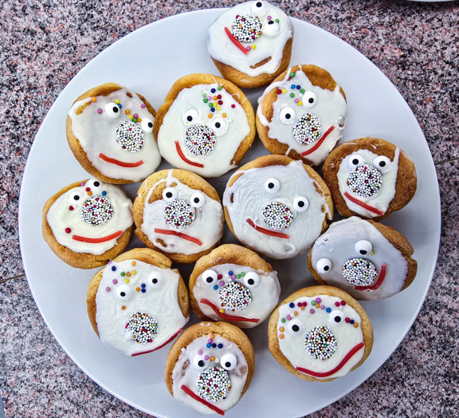 Das süße Gebäck, wie „Clown-Amerikaner“ und ein kunterbunt verzierter Schokokuchen rundeten das Faschingsbuffet perfekt ab.